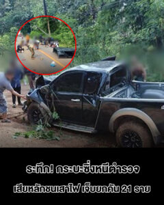 โดยที่เกิดเหตุพบรถกระบะ มิตซูบิชิ สีดำ ด้านหน้าชนกับเสาไฟฟ้าริมทางได้รับความเสียหาย ทรัพย์สินทางราชการเสียหายเป็นเสาไฟฟ้า 1 ต้น โดยมีแรงงานชาวเมียน จำนวน 21 ราย เป็นชาย 4 ราย หญิง 17 ราย ได้รับบาดเจ็บเป็นแผลตามร่างกายและใบหน้า เจ้าหน้าที่จึงปฐมพยาบาลในเบื้องต้นแล้วลำเลียงผู้ได้รับบาดเจ็บทั้งหมดส่งไปรักษาที่โรงพยาบาลสังขละบุรี ส่วนคนขับอาศัยช่วงชุลมุนวิ่งหลบหนีไปได้ จากการตรวจสอบอาการพบได้รับบาดเจ็บเพียงเล็กน้อย 18 ราย แพทย์ให้นอนรอดูอาการที่โรงพยาบาล จำนวน 3 ราย